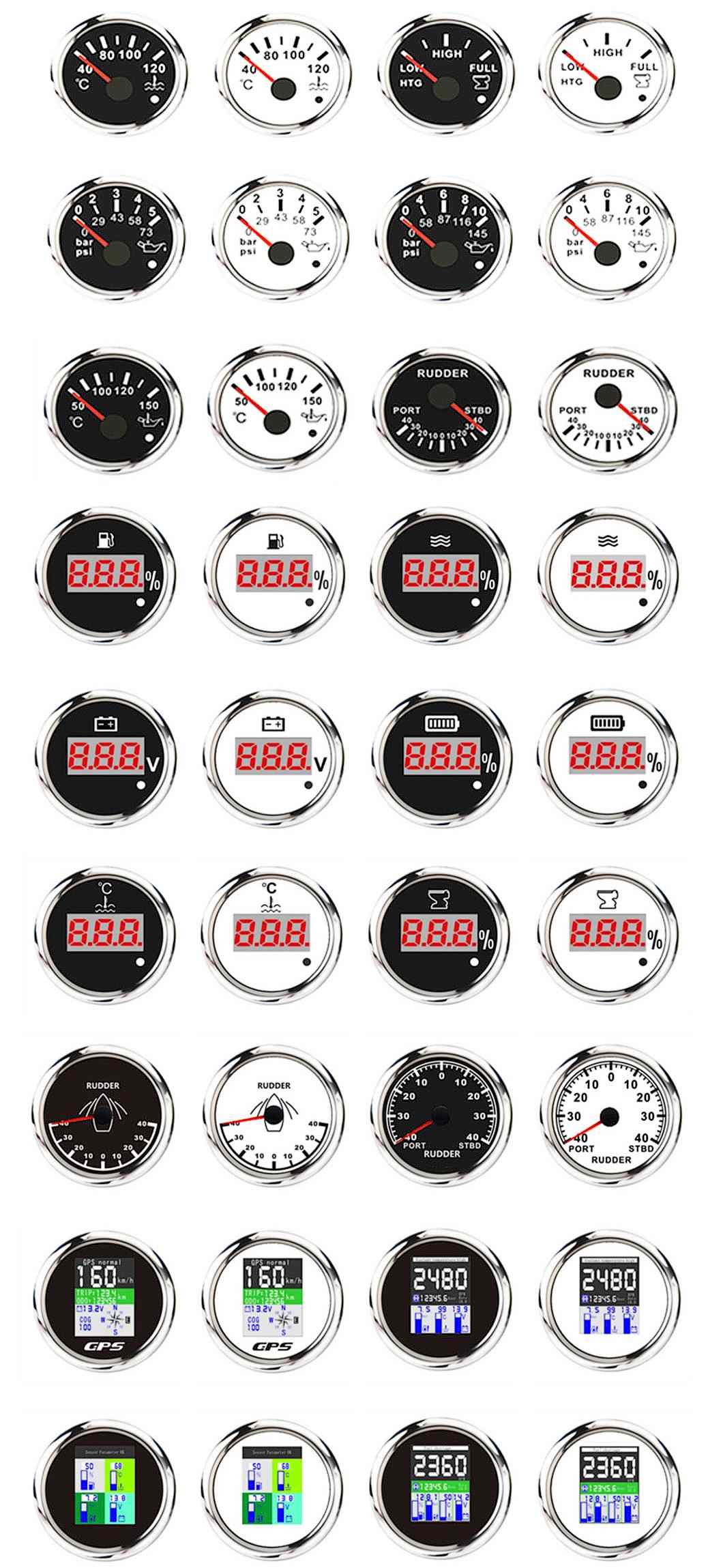 Jauge de carburant, GPS, 52 mm, température d'eau, consommation, tachymètre, voltmètre, manomètre, alarme